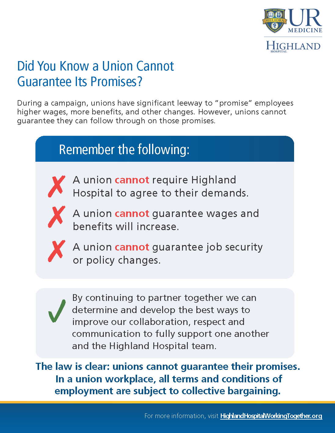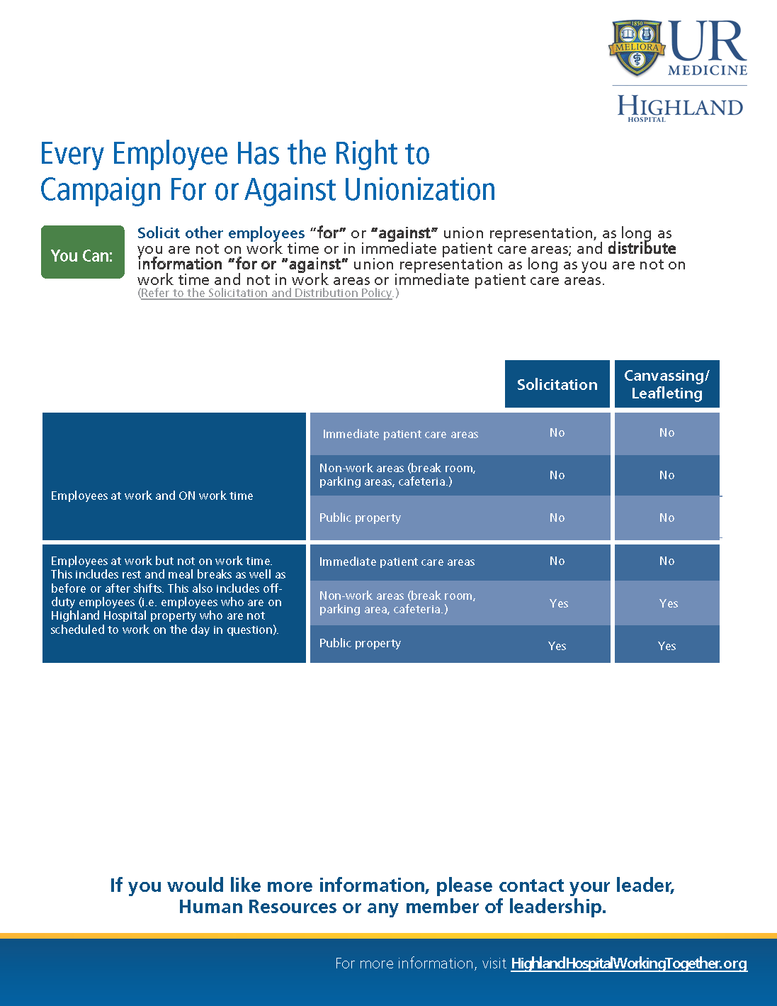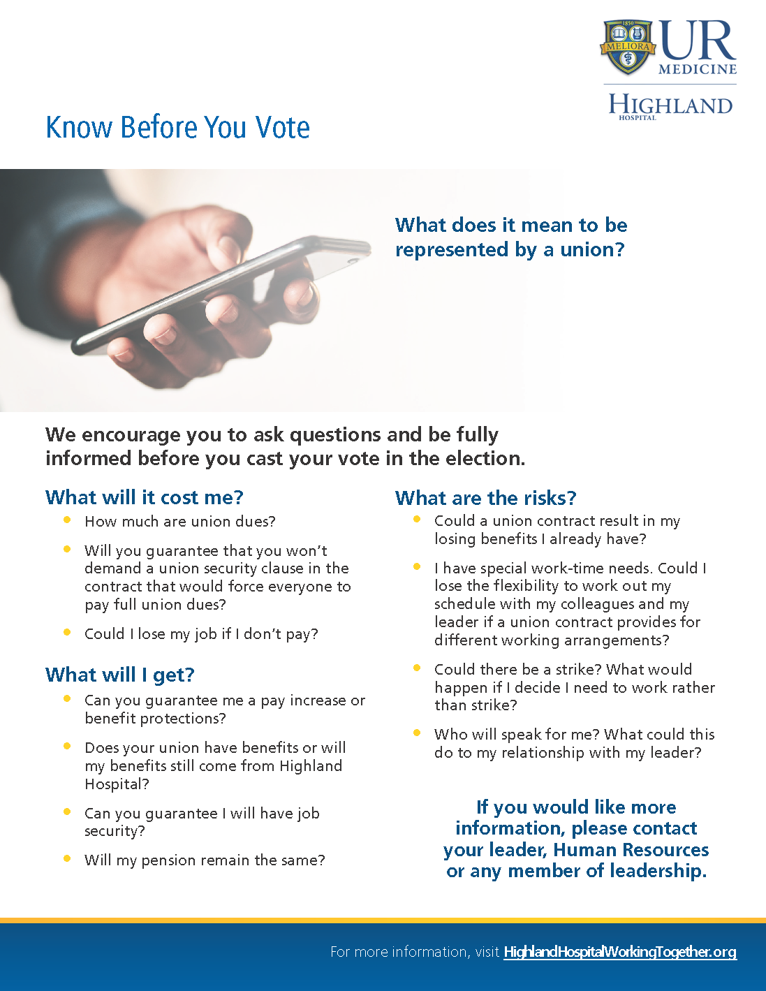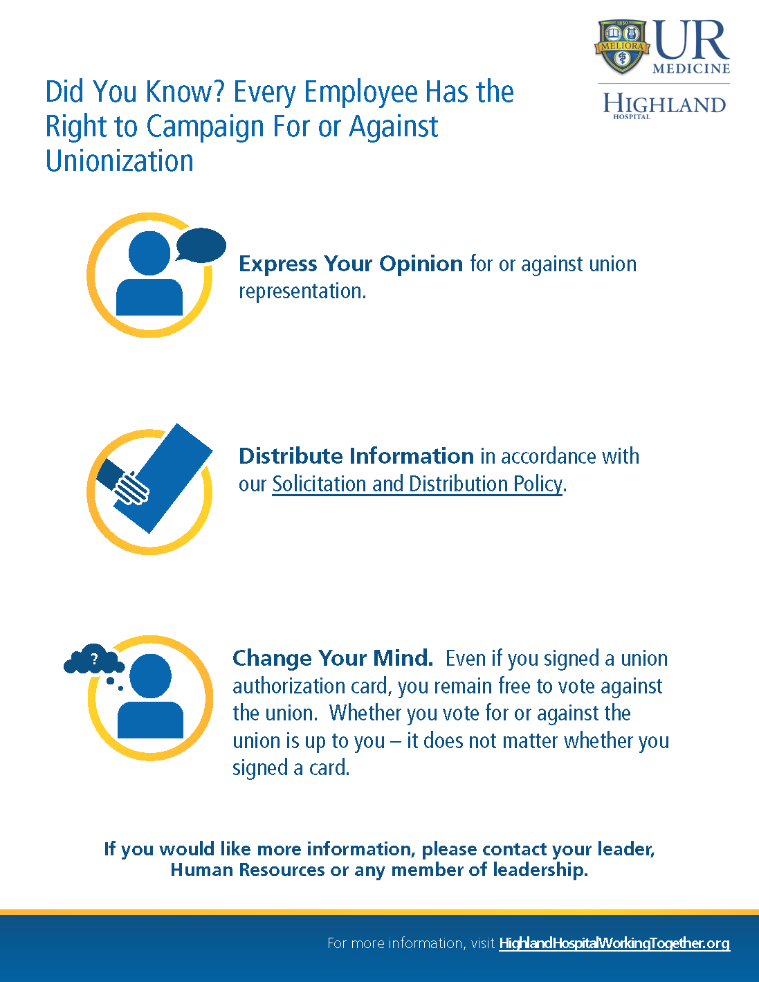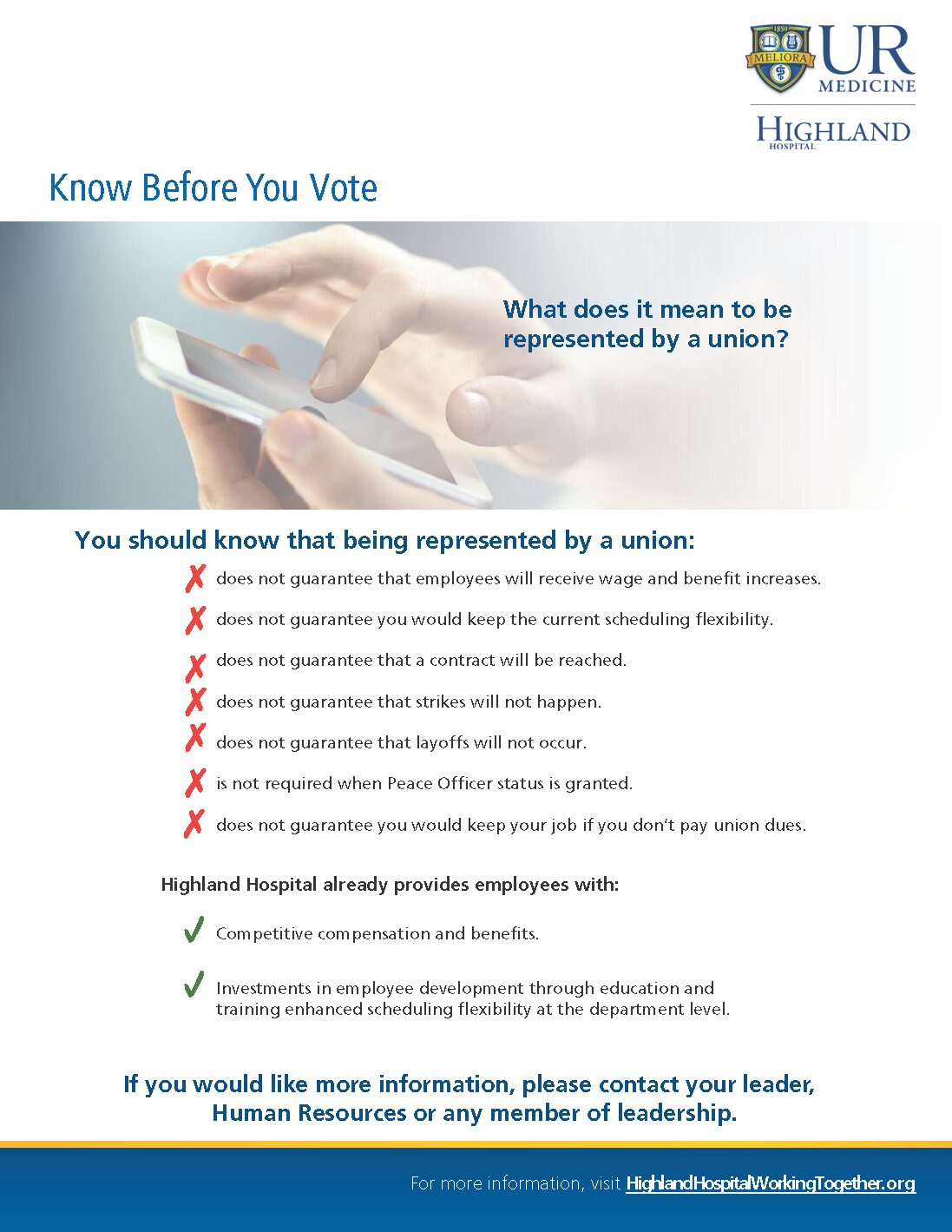 We recognize that various employee groups around the country, including right here in Rochester, have looked at union representation as a way to possibly have a greater say in their workplace. However, we hope you see that you already have tremendous input, through multiple avenues, including huddles and staff meetings, leadership rounding, employee surveys and other forums, on issues that impact our culture, work environment, professional development and patient care.